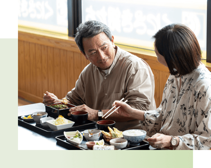 国東のブランド魚、太刀魚の「銀たち」が味わえる。刺身などの定番の料理はもちろん、特製のタレでいただく「太刀重」はここの名物料理。ふわっとした太刀魚の食感と甘みのあるタレ、アクセントになるシソの取り合わせが絶妙。